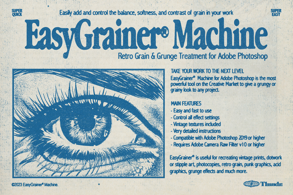 EasyGrainer® Machine for Adobe Photoshop is the most powerful tool on the Creative Market to give a retro grungy or grainy look to any project.